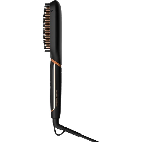 La brosse à lisser Grundig HB 7150 NaturaShine offre un coiffage moderne et flexible pour des cheveux lisses qui tombent doucement, une plénitude et un support à la base, ainsi que des pointes en forme. Le revêtement céramique de haute qualité avec de la macadamia et de l’huile de noix de coco assure des cheveux plus sains et hydratés avec plus de brillance et une répartition uniforme de la chaleur. La fonction ionique intégrée a un effet antistatique et équilibre la teneur en humidité des cheveux en plaçant de nombreux ions de manière protectrice autour de la fibre capillaire et en compensant la perte d’humidité causée par la chaleur. Les cheveux sont brillants et doucement hydratés et vitalisés. La brosse lissante HB 7150 NaturaShine dispose d’un contrôle individuel de la température en 5 étapes, de 130 à 210 °C, pour coiffer les cheveux fins, normaux et épais de manière ciblée.